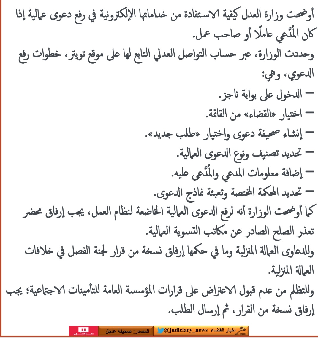 خدمة رفع الوثائق تحقق من وكالة التحقق من إقرار. دعت وزارة العدل المستفيدين للتعرف على الخدمات الإلكترونية المتعددة التي تقدمها عن بُعد، ومن هذه الخدمات المقدمة خدمة رفع الدعوى القضائية إلكترونيًا. المادة 46 من نظام التنفيذ تنص بأنه إذا لم يقم المدين بالتنفيذ ، أو إذا لم يفصح عن أموال كافية لكي يفي بالدين خلال خمسة أيام من تاريخ إبلاغه بأمر التنفيذ أو من تاريخ نشره بإحدى الصحف إذا تعذر إبلاغه ، فإنه يعد مماطلاً. كل ما تريد معرفته عن قرار إلغاء إيقاف الخدمات الحكومية الإلكترونية. واشترطت وزارة العدل على كل زوجين تقدم أي أحد منهما بطلب إثبات الطلاق أو الخلع أو دعوى فسخ النكاح وكان بينهما أطفال معالجة حقوق الأطفال في الحضانة والنفقة والزيارة قبل انفصالهما، بإضافة مادة للوائح التنفيذية لنظام.